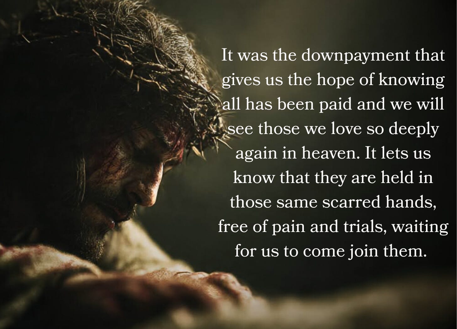 The resurrection instead is our promise. It was the downpayment that gives us the hope of knowing all has been paid and we will see those we love so deeply again in heaven. It lets us know that they are held in those same scarred hands, free of pain and trials, waiting for us to come join them.