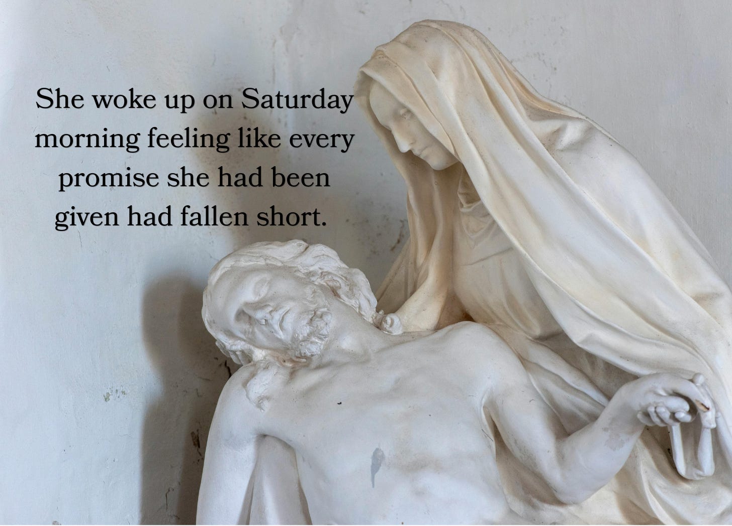 I think about Mary. She was told her son would be the Messiah. Instead she watched Him be beaten almost to death and then hung on a cross while He was mocked and struggled for every breath He took. She woke up on Saturday morning feeling like every promise she had been given had fallen short.